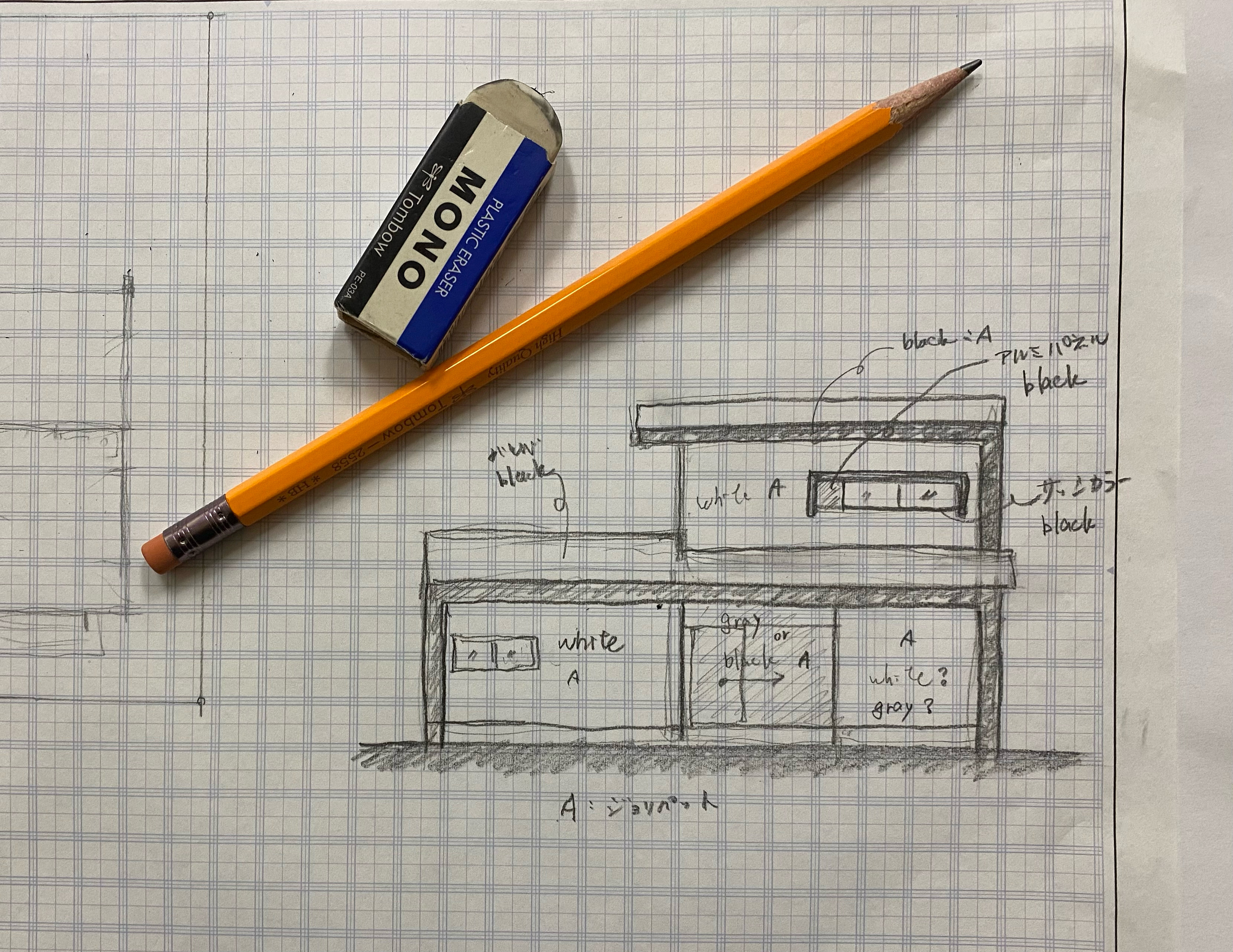 デザイン設計の入り口 今回は、お客様の要望から1階と2階のボリュームを考えて、先ずは外観デザインを考えてみました。ファーストインスピレーションですね。。